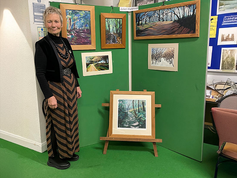 Our local painters, Clare DuVergier, Juliet Harkness, and Annabel Anderson, shared not only their stunning artworks but also the stories behind them. Each piece was a window into the Quantocks’ beauty, and the artists generously offered insights into the places and moments that inspire their creativity, making each viewing a personal journey through the landscape.